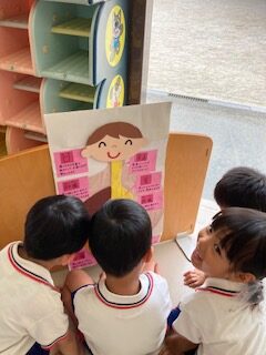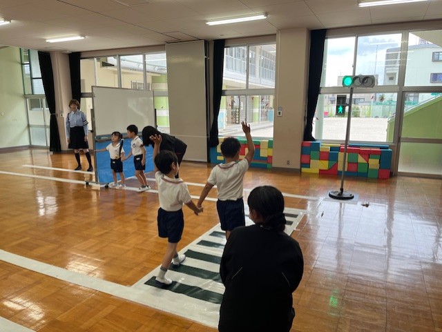 人形のケンちゃんが交通安全について大切なことを教えてくれているよ!みんな真剣に聞いています!