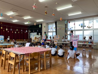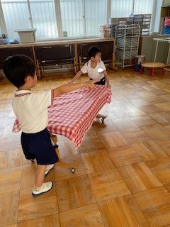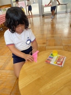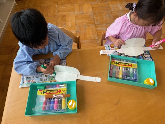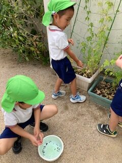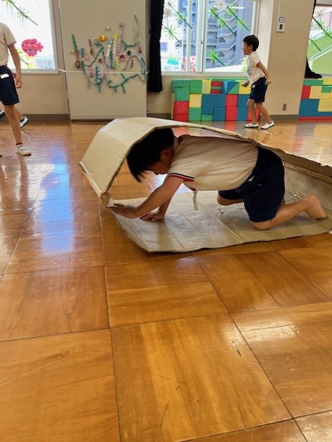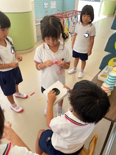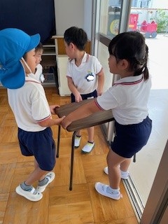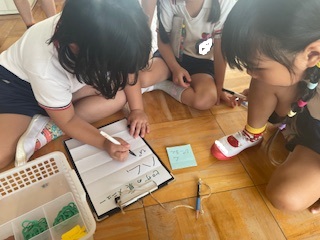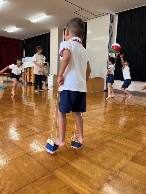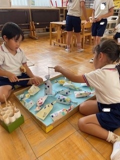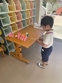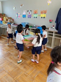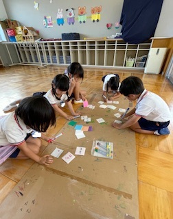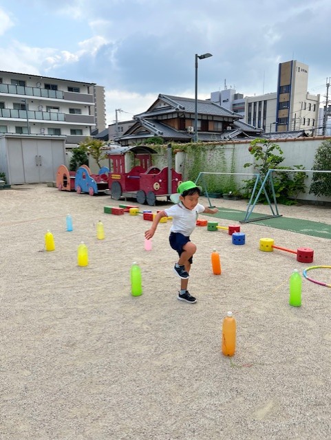 日中はまだまだ残暑厳しい中ですが、園庭やホール・廊下などで好きな遊びを十分に楽しんでいます。同年齢や異年齢の友だちとのやりとりもどんどんと増え、「考える」「試す」「協力する」「相談する」など様々なことを経験しています!