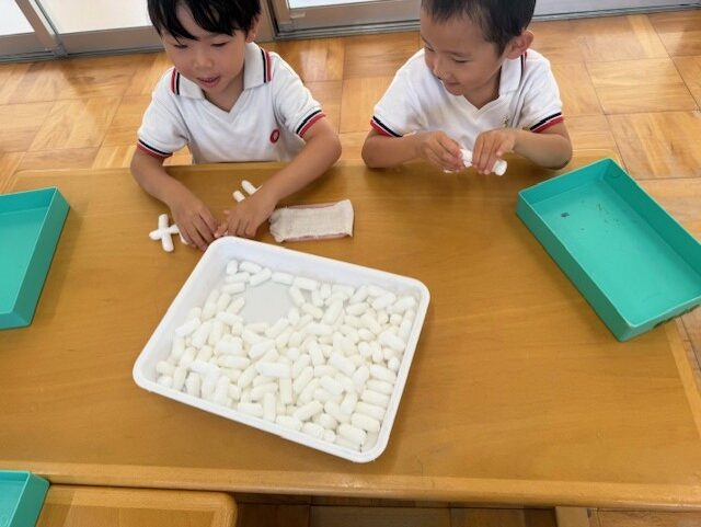 エココーンをつなげて遊んでいるよ!水でくっつくのが面白かったね♪