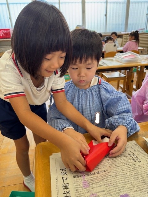 縦割りチームでお楽しみ会の準備!セロファンを輪ゴムでとめたら、おいしいリンゴ飴の完成♡