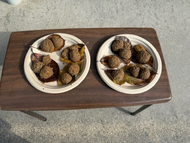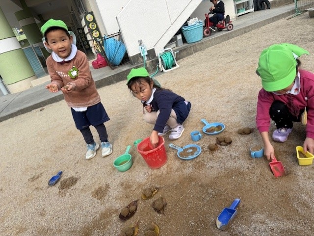 暖かい日には、砂や水を使ってみんなでお団子作り♪