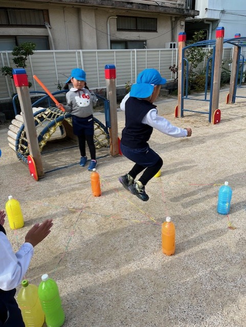 少し難しいゴム跳びにも挑戦中!!コースも自分たちで考えているよ!