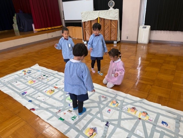 大きな模造紙に道路が出来たよ!「おうちはどこに貼ろうかな?」みんなで相談しながら決めています。