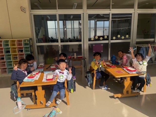 お天気の良い日に廊下で昼食。遠足気分で「いただきま~す!」