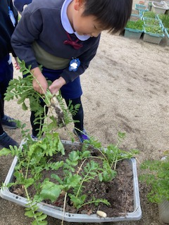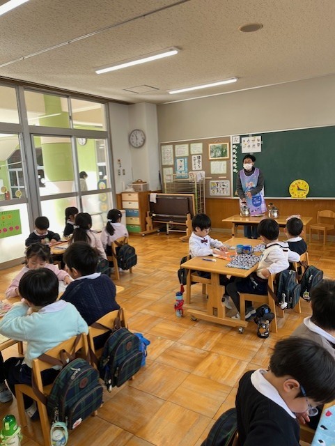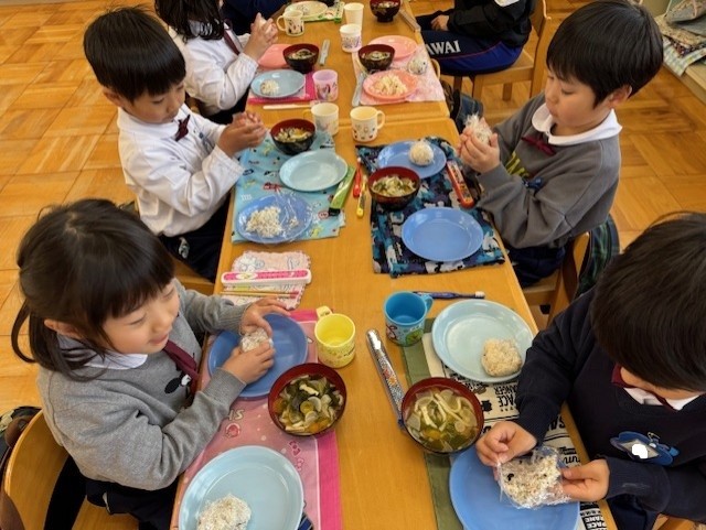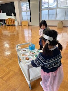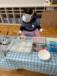 三学期から年中組もクッキングが始まりました。昆布とかつおぶしのだしの試飲をして、匂いや味の違いを知ったよ!