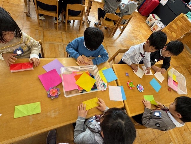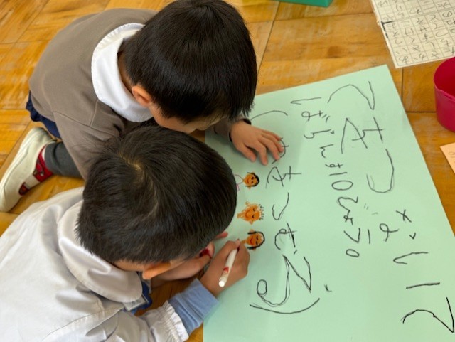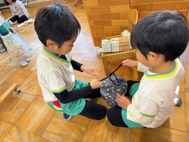 「こうするよ!」年長さんが年中さんにやり方を教えてくれています!