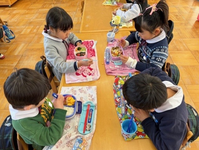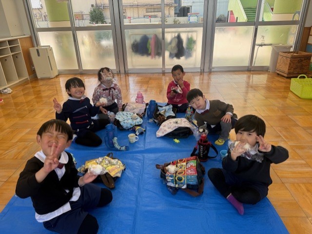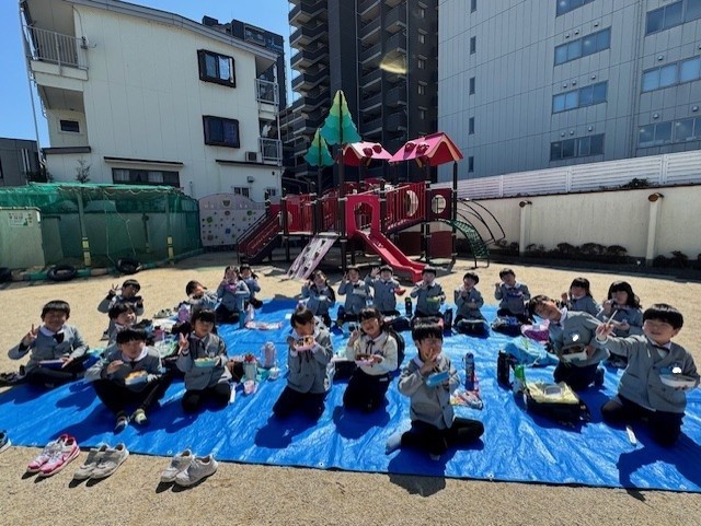 幼稚園最後のお弁当は、たくさん遊んだ総合遊具の前で美味しくいただいたよ!!