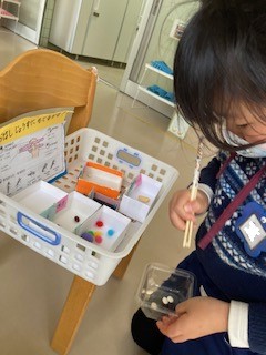 ビーズや色々な大きさの豆をつかんでみよう。集中しています!