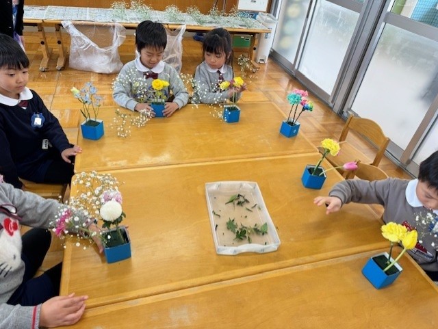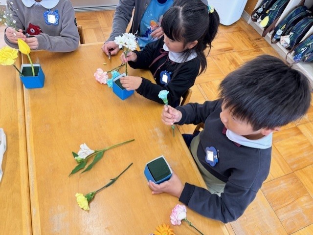 卒園式で飾るお花のアレンジメント。どこに挿そうかな?