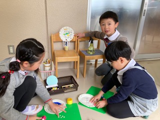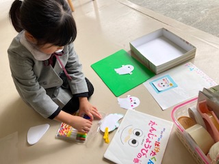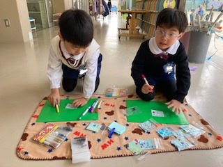 卒園式で飾る気球作り。型抜きで模様にしたりシールを貼って工夫して作っているよ!