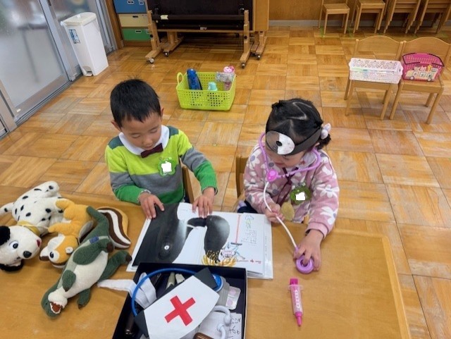 発表会の劇『ねこのおいしゃさん』の絵本からごっこ遊びをしているよ♪