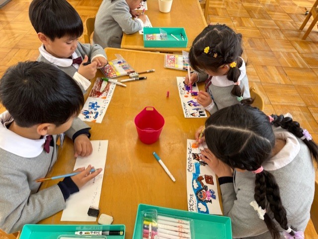 幼稚園の思い出や将来の夢を、絵や言葉で書いているよ。